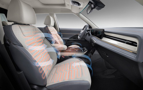 Дополнительный комфорт Musso EV придают руль и сиденья с подогревом. Передние сиденья имеют также опору для поясницы с электроприводом, а в жаркие летние дни можно включить вентиляцию.